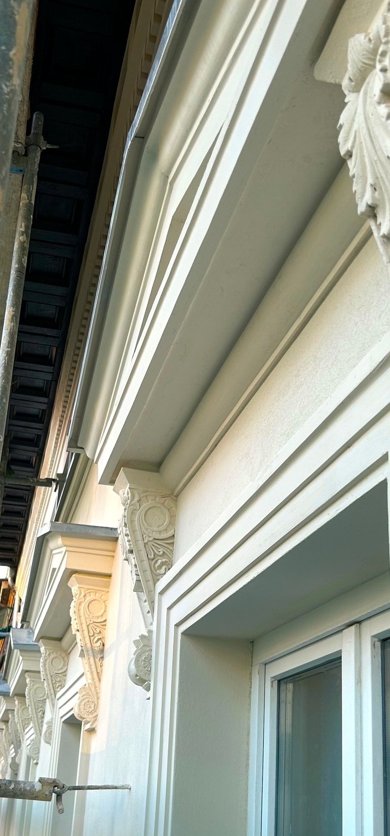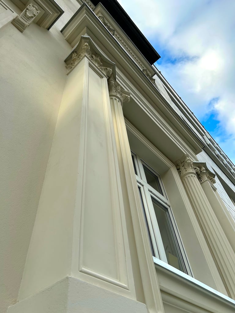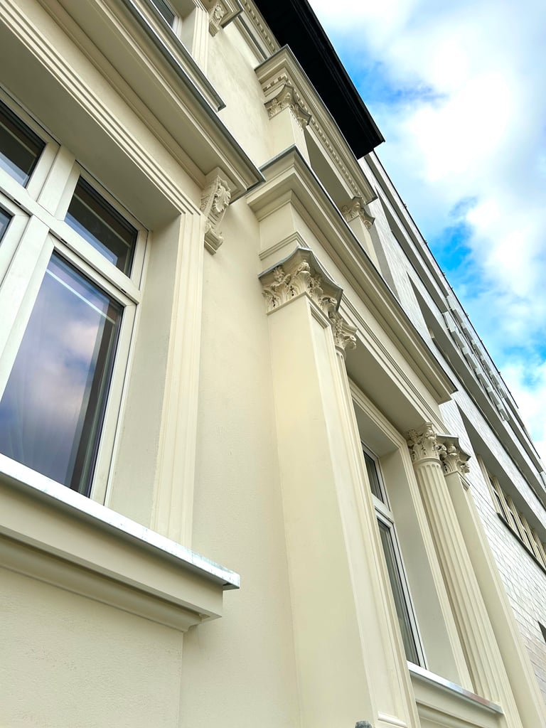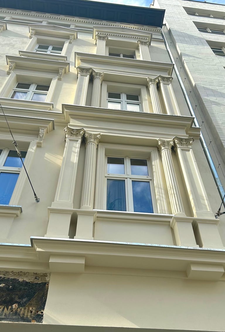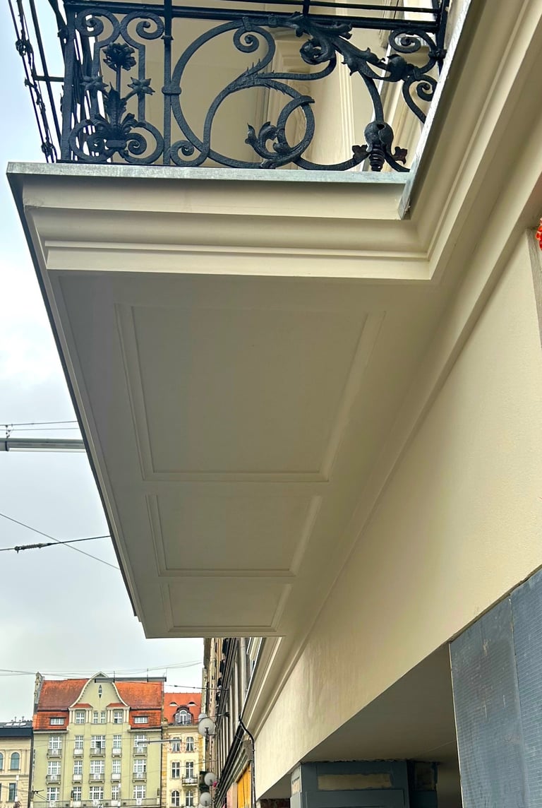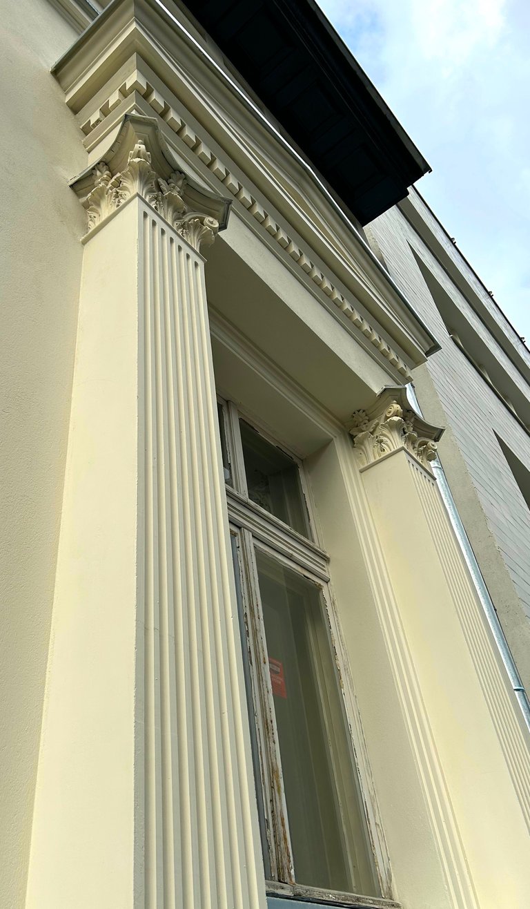 Wszystkie okna otaczały dekoracyjne ramy zwieńczone koronami, które również zostały precyzyjnie zrekonstruowane. Zniszczone fragmenty elewacji uzupełniono z zachowaniem historycznego charakteru oraz oryginalnych proporcji. Całość przywróciła budynkowi elegancję i spójność jego XIX-wiecznego stylu.