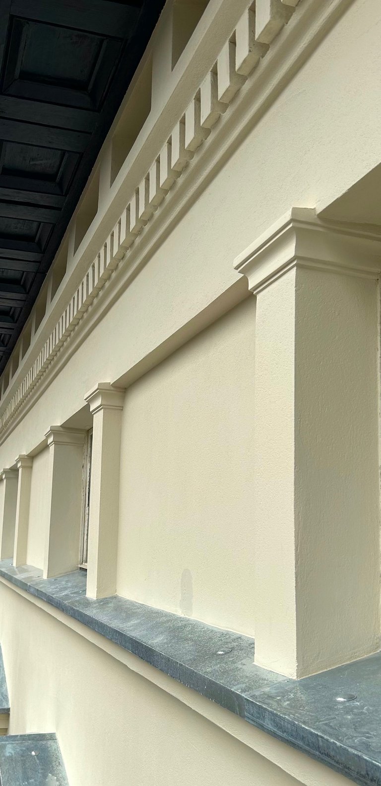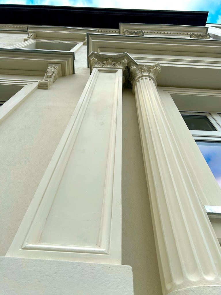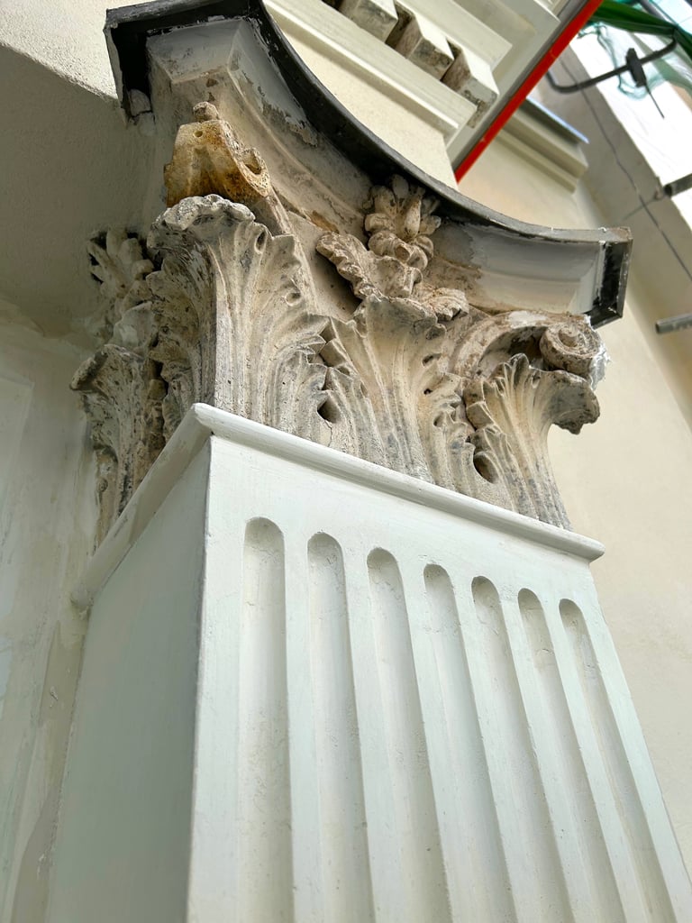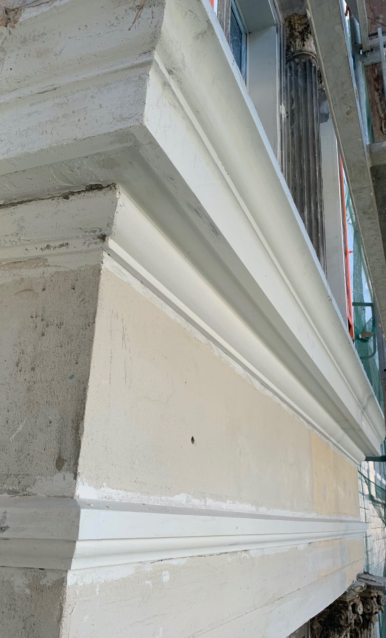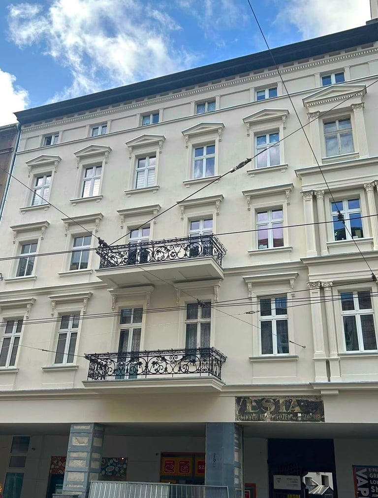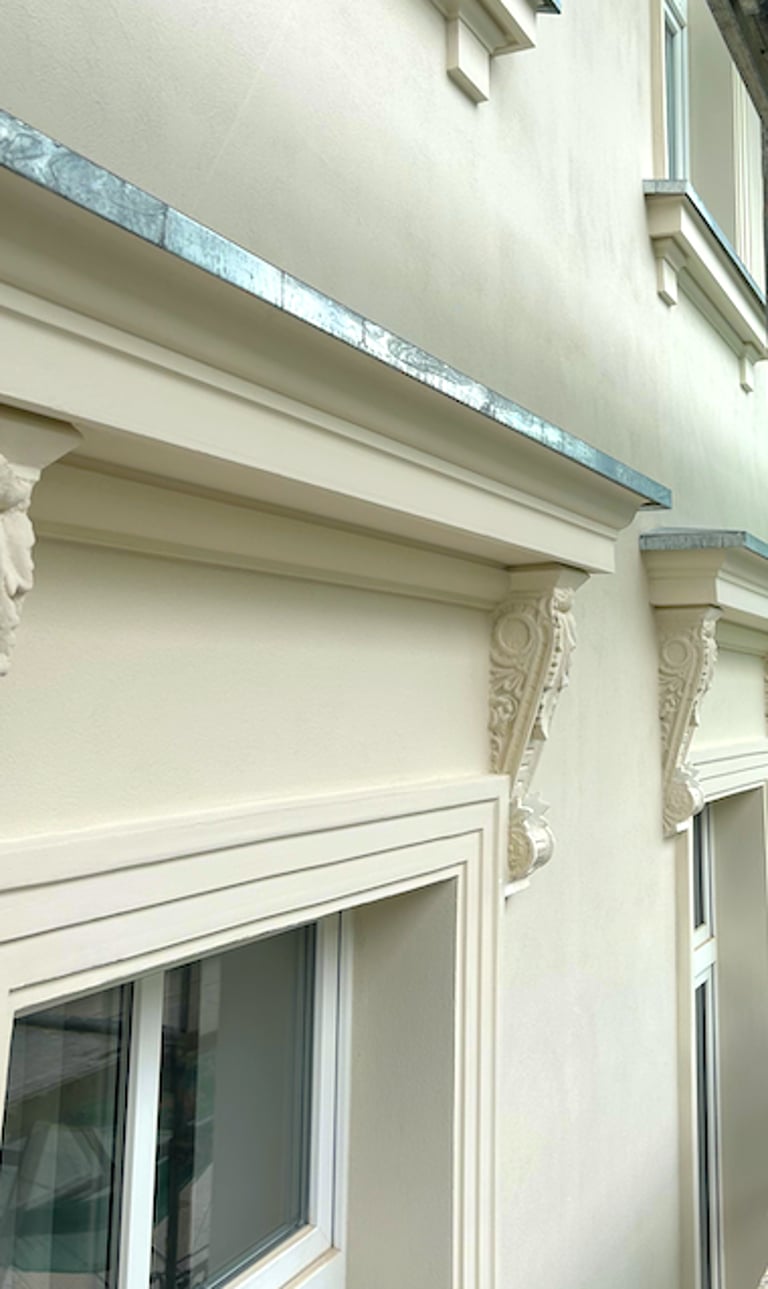 Wszystkie okna otaczały dekoracyjne ramy zwieńczone koronami, które również zostały precyzyjnie zrekonstruowane. Zniszczone fragmenty elewacji uzupełniono z zachowaniem historycznego charakteru oraz oryginalnych proporcji. Całość przywróciła budynkowi elegancję i spójność jego XIX-wiecznego stylu.