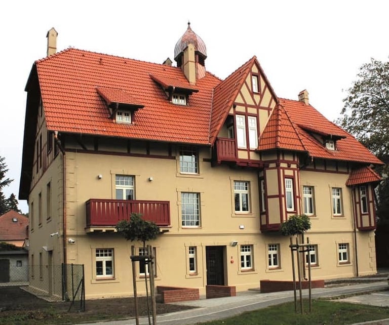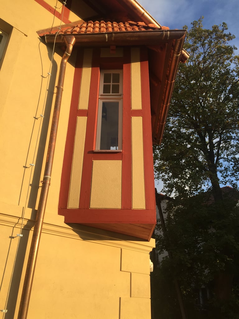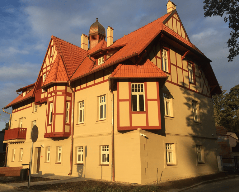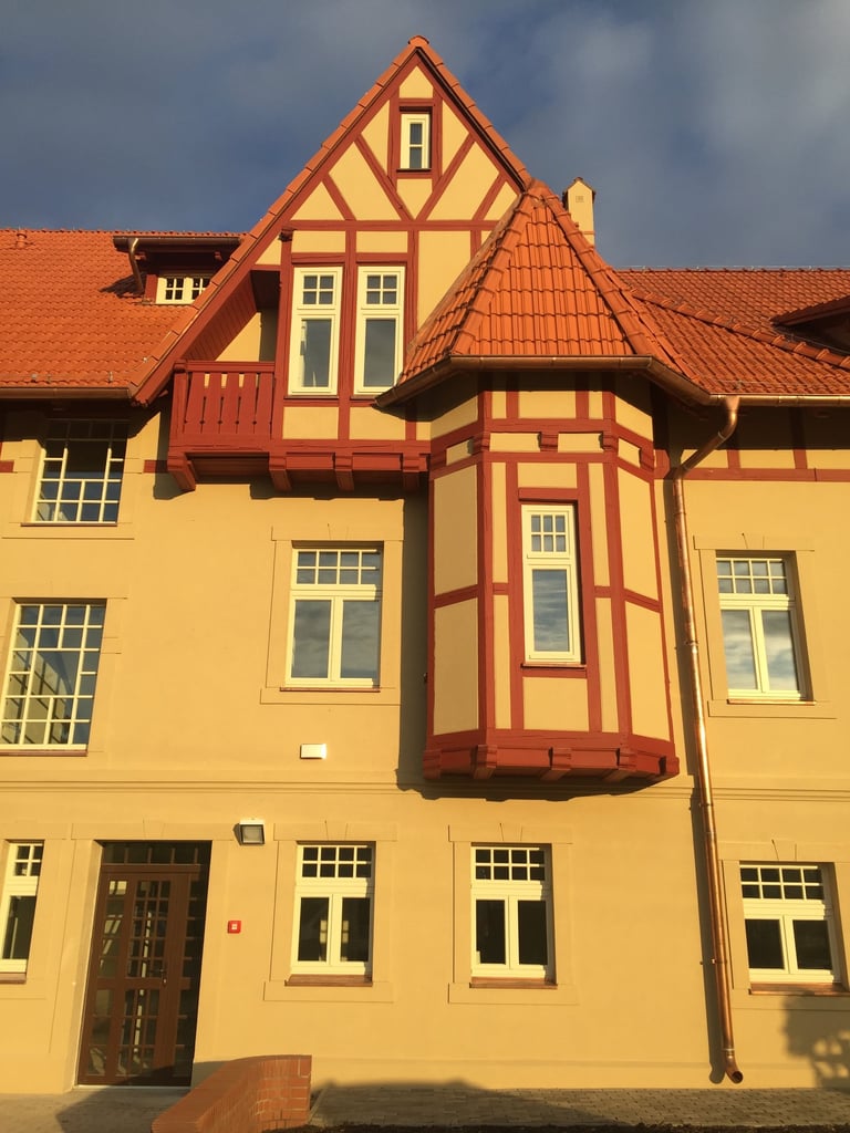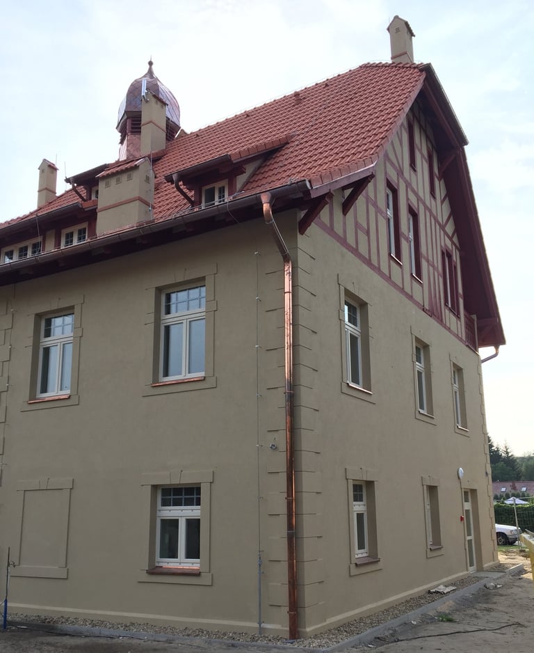 Obramowania okien oraz detale architektoniczne zostały wiernie zrekonstruowane na podstawie oryginalnych form sprzed renowacji.