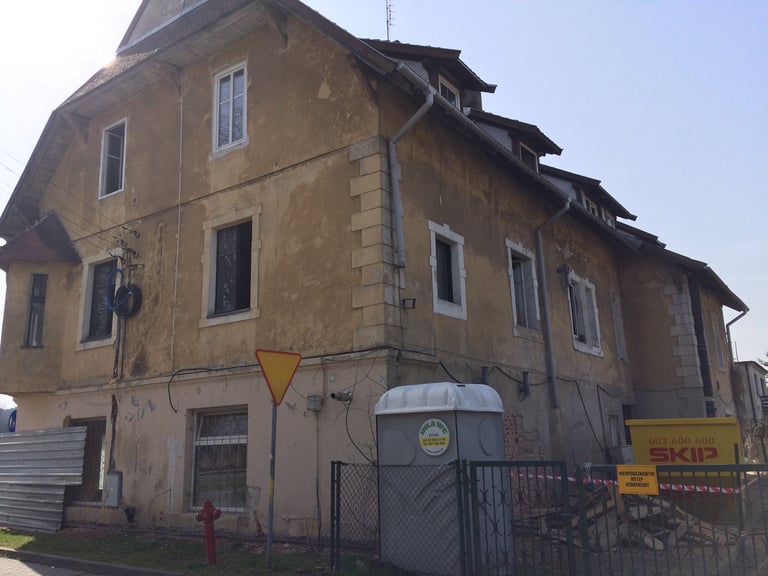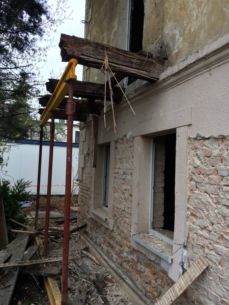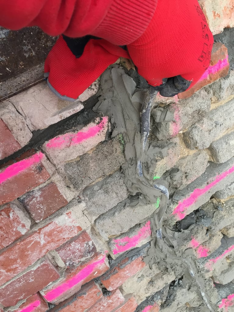 Pęknięcia elewacji wzmocniono poprzez głębokie naprawy i zastosowanie skręcanej stali, co zapewniło trwałą stabilizację budynku.