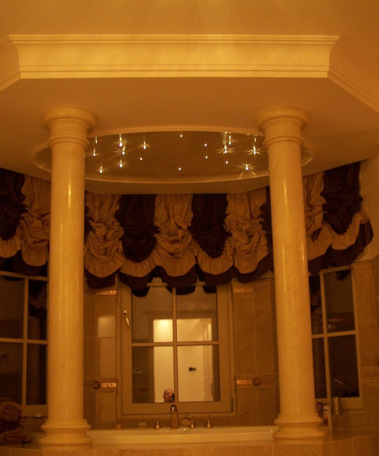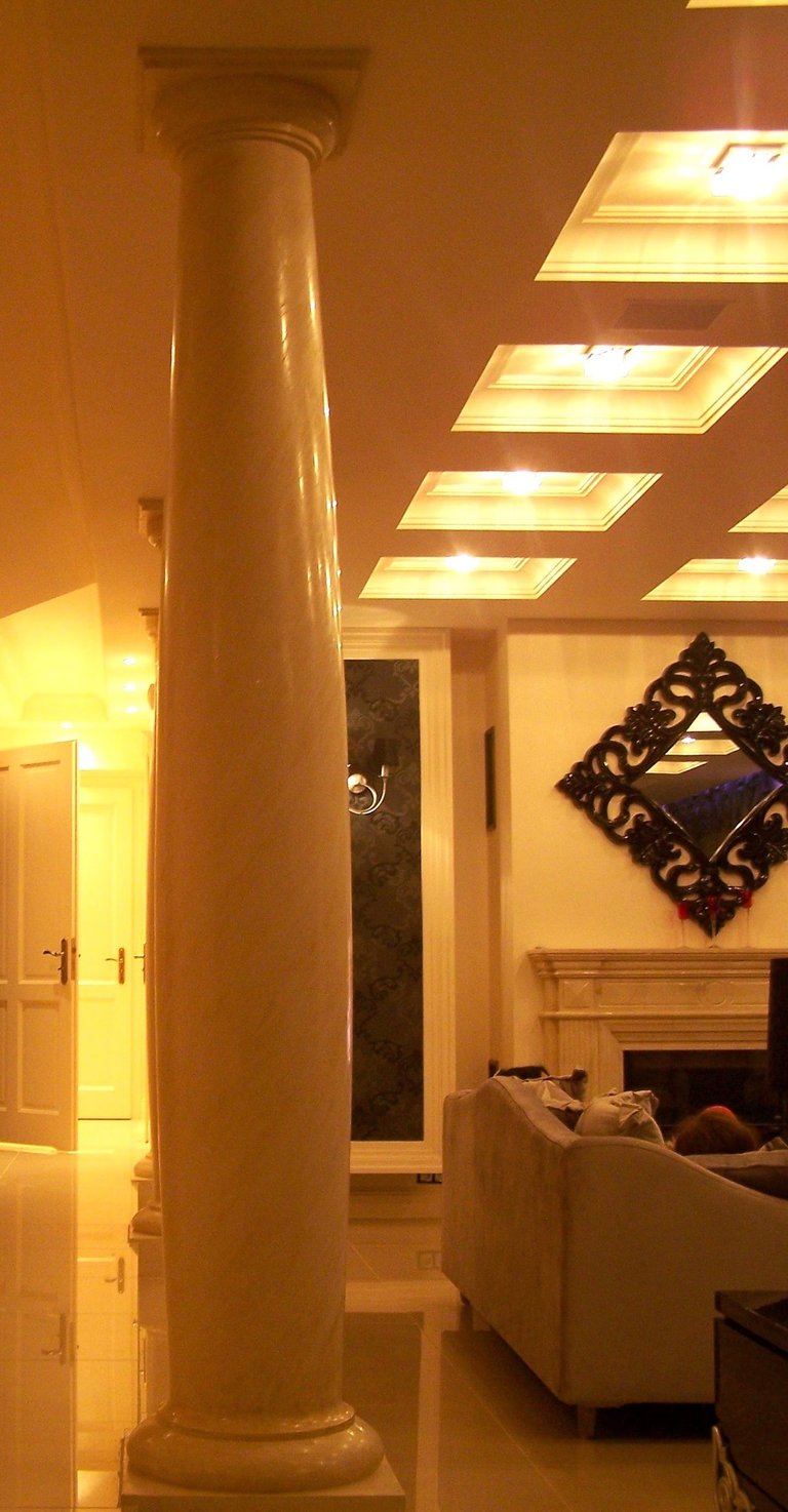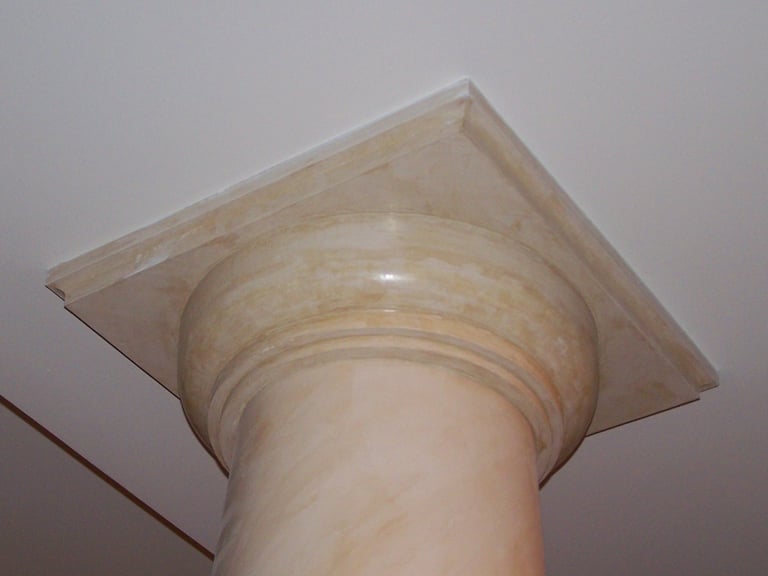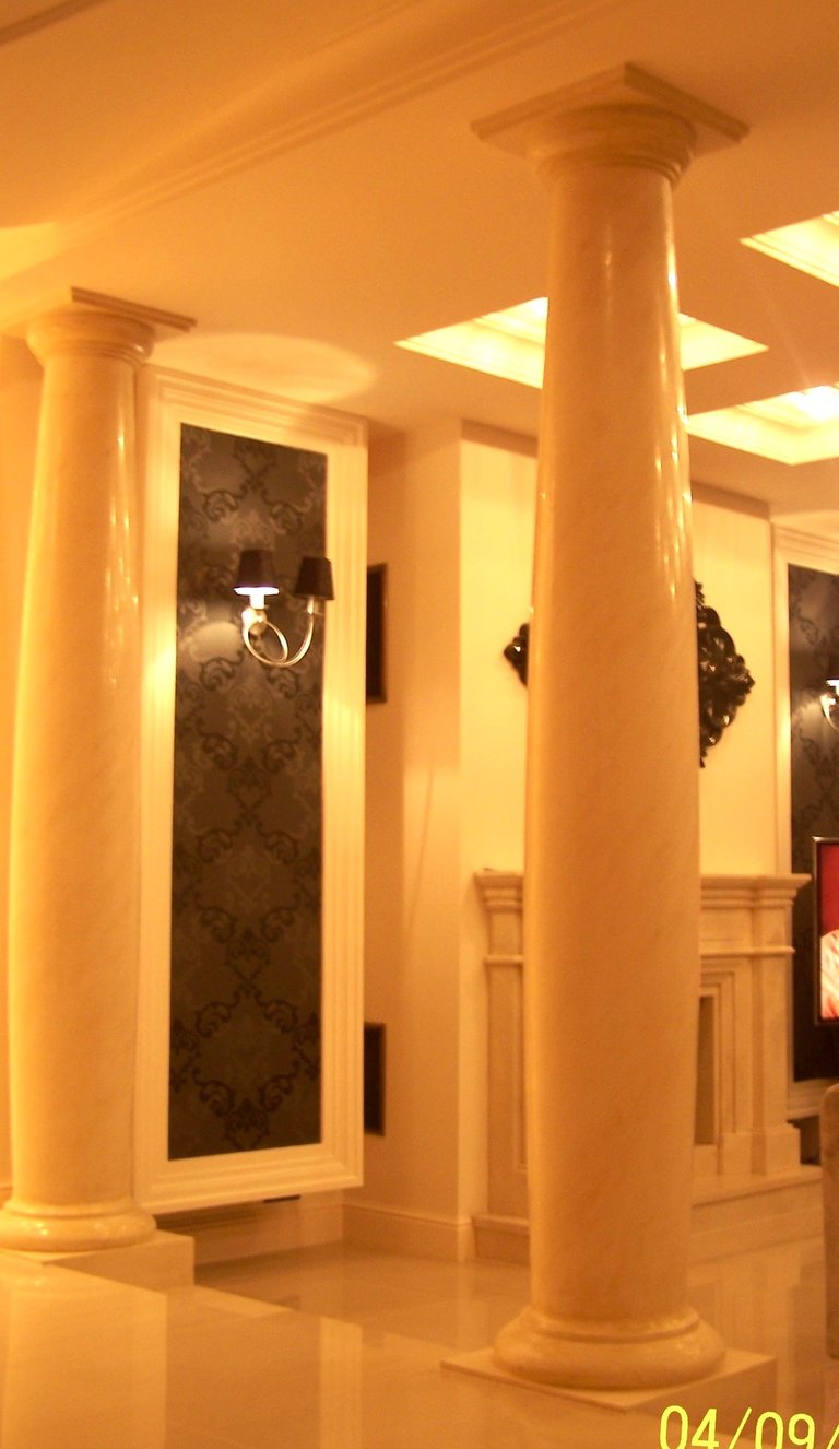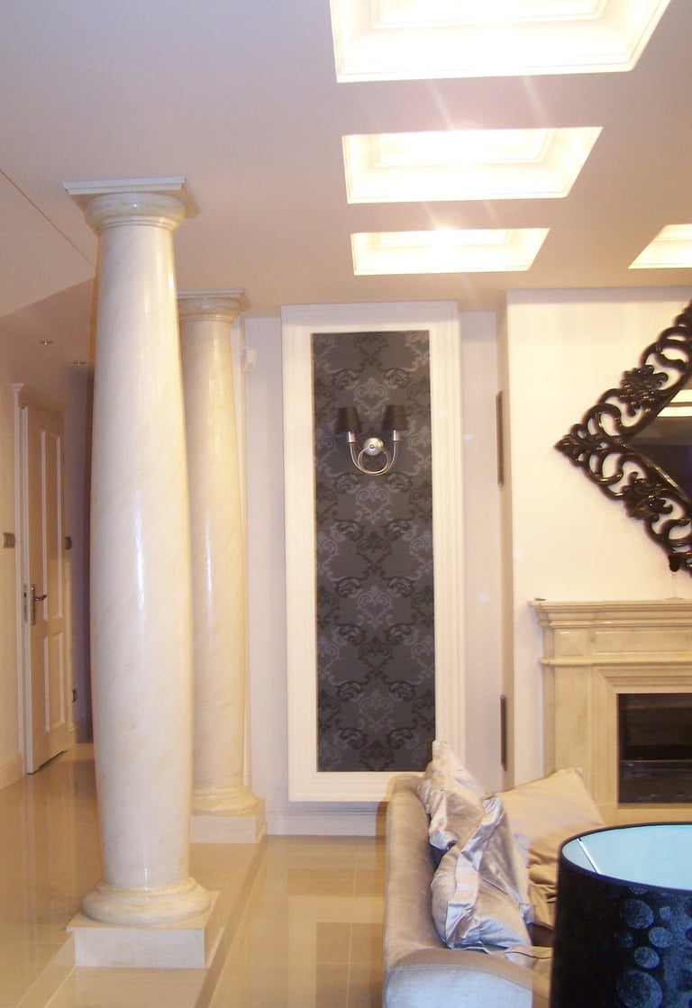 Wykonaliśmy pełną zabudowę sztukateryjną wnętrza oraz ręczne wykończenie kolumn techniką stIukU , nakładając kilka warstw specjalnego materiału.